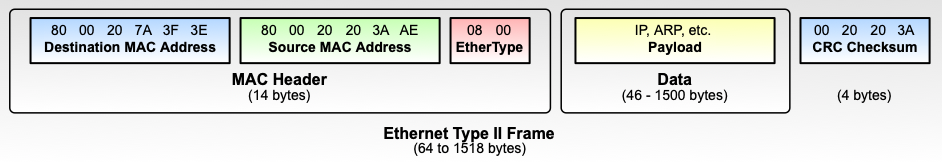 Ethernet μ 물리 μ£ΌμμΈ MAC Address μ£Όμλ₯Ό ν¬ν¨νμ¬, λͺ©μ μ§μ MAC Addressμ μΆλ°μ§μ MAC Address λ₯Ό ν¬ν¨νλ€.
