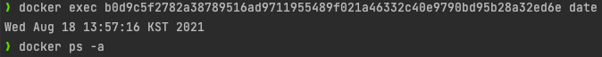 ๊ทธ๋์ docker exec ๋ช ๋ น์ด๋ก ํด๋น ์ปจํ ์ด๋์ ์๊ฐ์ ํ์ธํด๋ณด๋