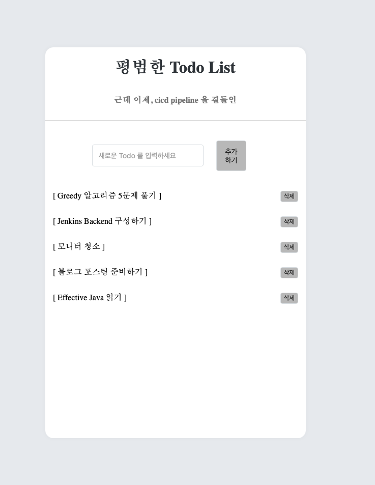 GitHub - my-research/todo-with-cicd: Jenkins๋ฅผ ์ด์ฉํ์ฌ CICD Pipeline ์ด ๊ตฌ์ฑ๋ TodoList