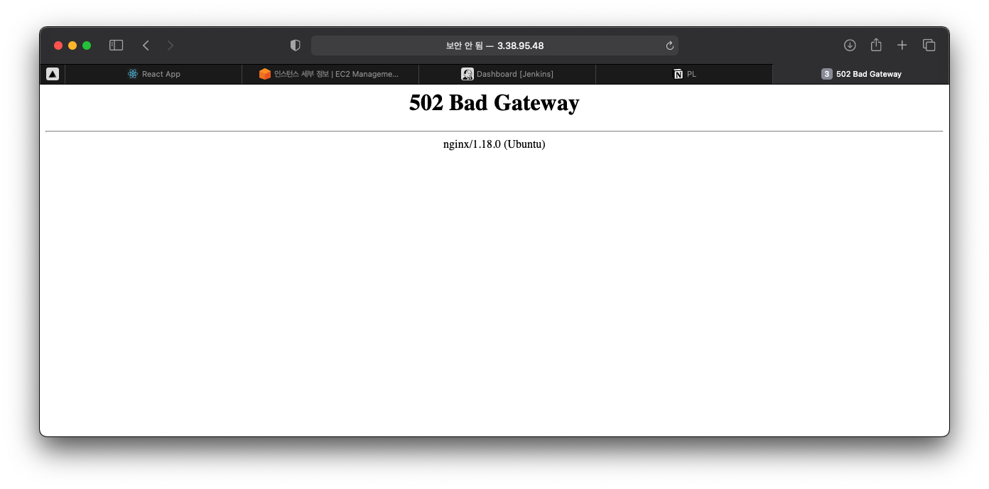 ๊ทธ๋ฆฌ๊ณ sudo systemctl reload nginx ๋ฅผ ์ด์ฉํด์ nginx ๋ฅผ ์ฌ์คํํ๊ณ ec2 ์ธ์คํด์ค์ 80 ํฌํธ๋ก ์ ๊ทผํ๋ฉด ๋ค์๊ณผ ๊ฐ์ด nginx ๊ฐ 502 ์๋ฌ๋ฅผ ๋ฐํํ๊ฒ ๋๋ค.