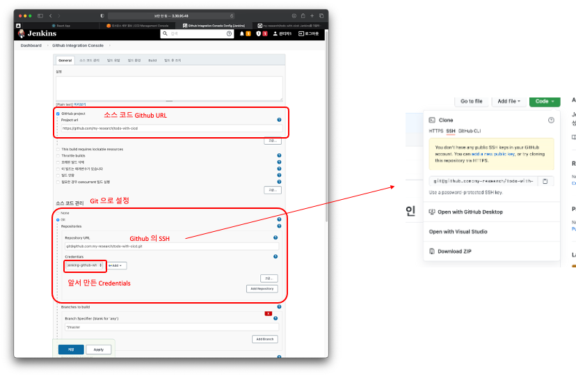 ๊ทธ๋ฌ๋ฉด ์ฐ๋์ ์ํ ์ฌ๋ฌ ์ค์ ์ ๋ณด, Github ํ๋ก์ ํธ๊ฐ ์๋ URL ์ด ํ์ํ๊ธฐ๋ ํ๊ณ ์ฝ๋ ๊ด๋ฆฌ๋ฅผ ์ํ Github Repository์ SSH ์ฃผ์ ๋ฐ Jenkins ์ Credentials ๊ฐ ํ์ํ๋ค.