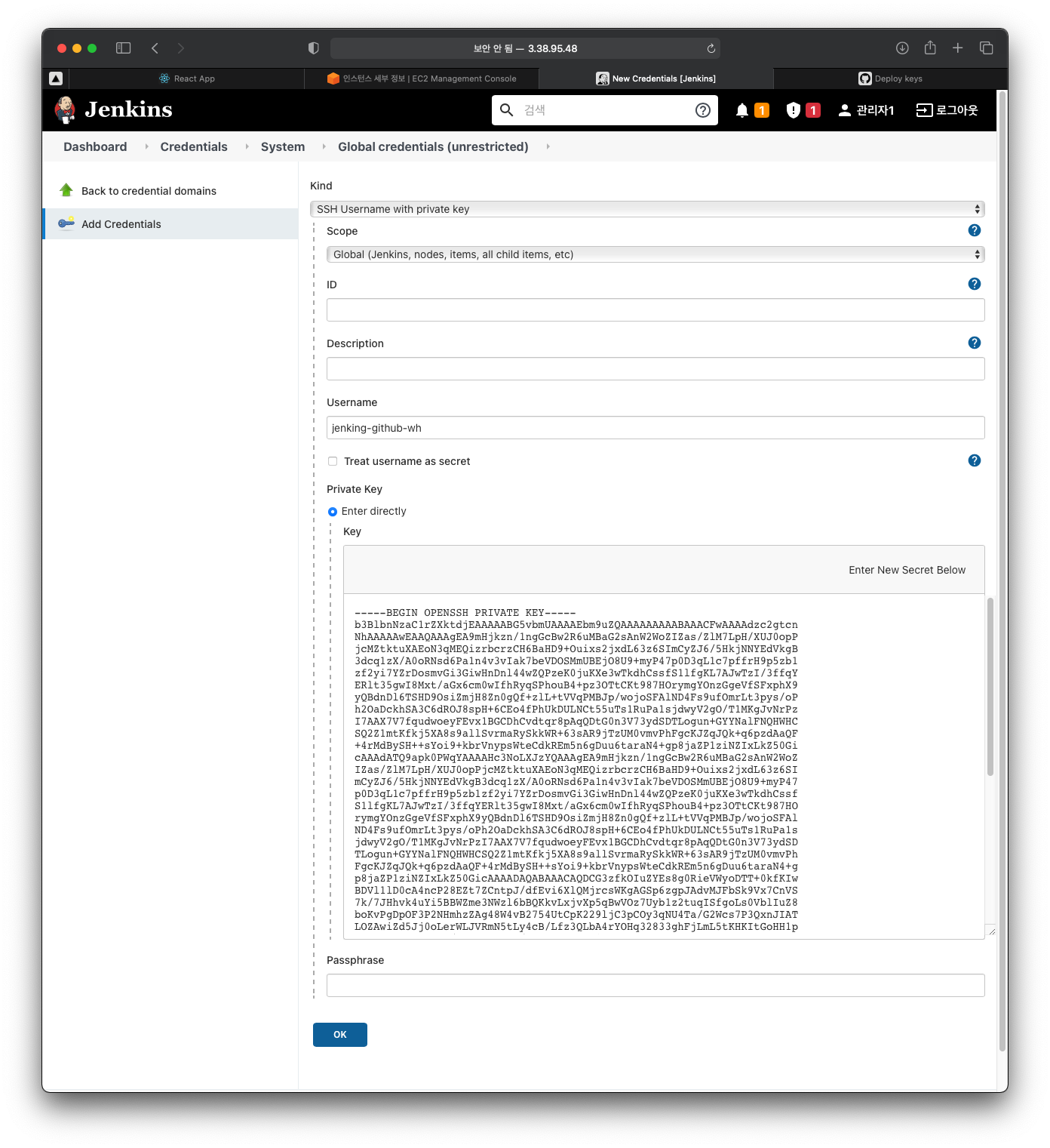๊ทธ๋ฆฌ๊ณ Scope๋ฅผ Global์ Jenkins Node๋ก ์ค์ ํ ๋ค, Username ์ ์๊น ๋ง๋ค์ด์ค RSA Key์ ์ด๋ฆ๊ณผ ๋์ผํ๊ฒ ์ค์ ํ์