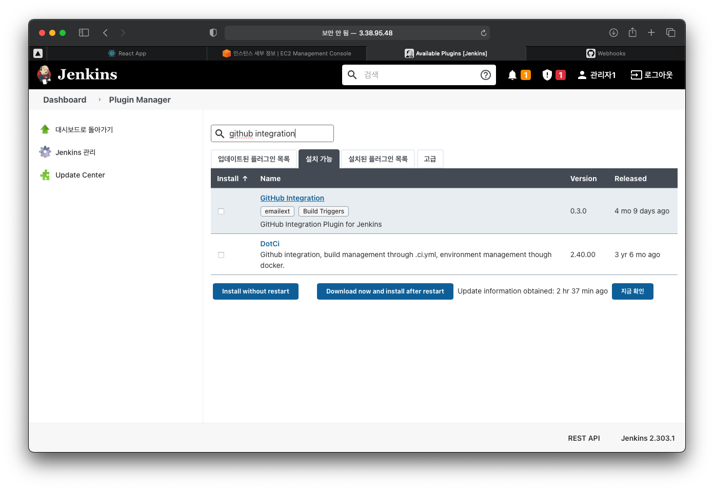 ๋ค์ Jenkins ๋์๋ณด๋๋ก ๋์๊ฐ์ Jenkins -> Dashboard -> Jenkins ๊ด๋ฆฌ -> ํ๋ฌ๊ทธ์ธ ๊ด๋ฆฌ -> ์ค์น๊ฐ๋ฅ ์ผ๋ก ์ด๋ํ ํ github integration ํ๋ฌ๊ทธ์ธ์ ์ถ๊ฐํ๊ณ ์ฌ์คํ ์์ผ์ฃผ์