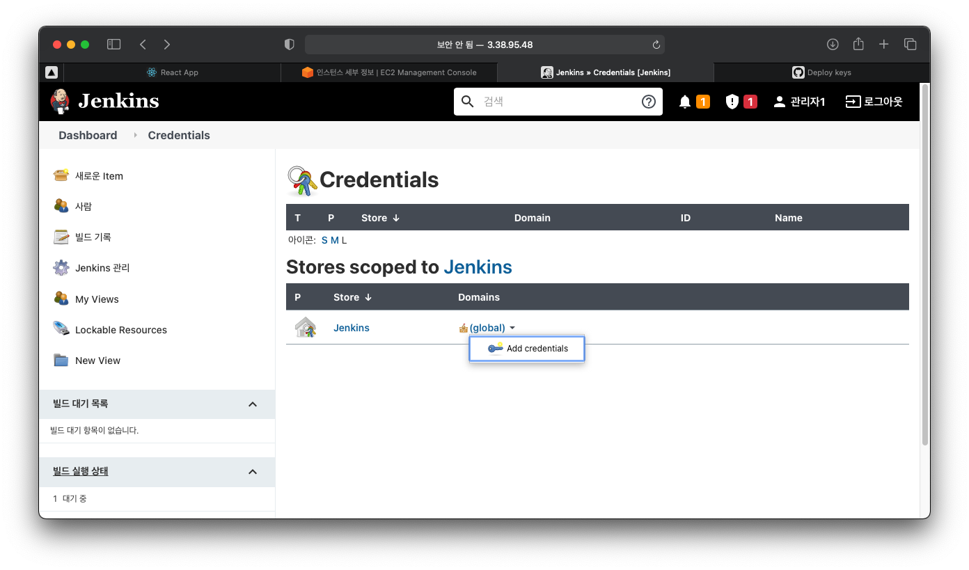 Jenkins ์น ๋์๋ณด๋๋ก ์ด๋ํ ๋ค, Jenkins ๊ด๋ฆฌ ํญ์์ Manage Credentials๋ฅผ ํด๋ฆญํด๋ณด์