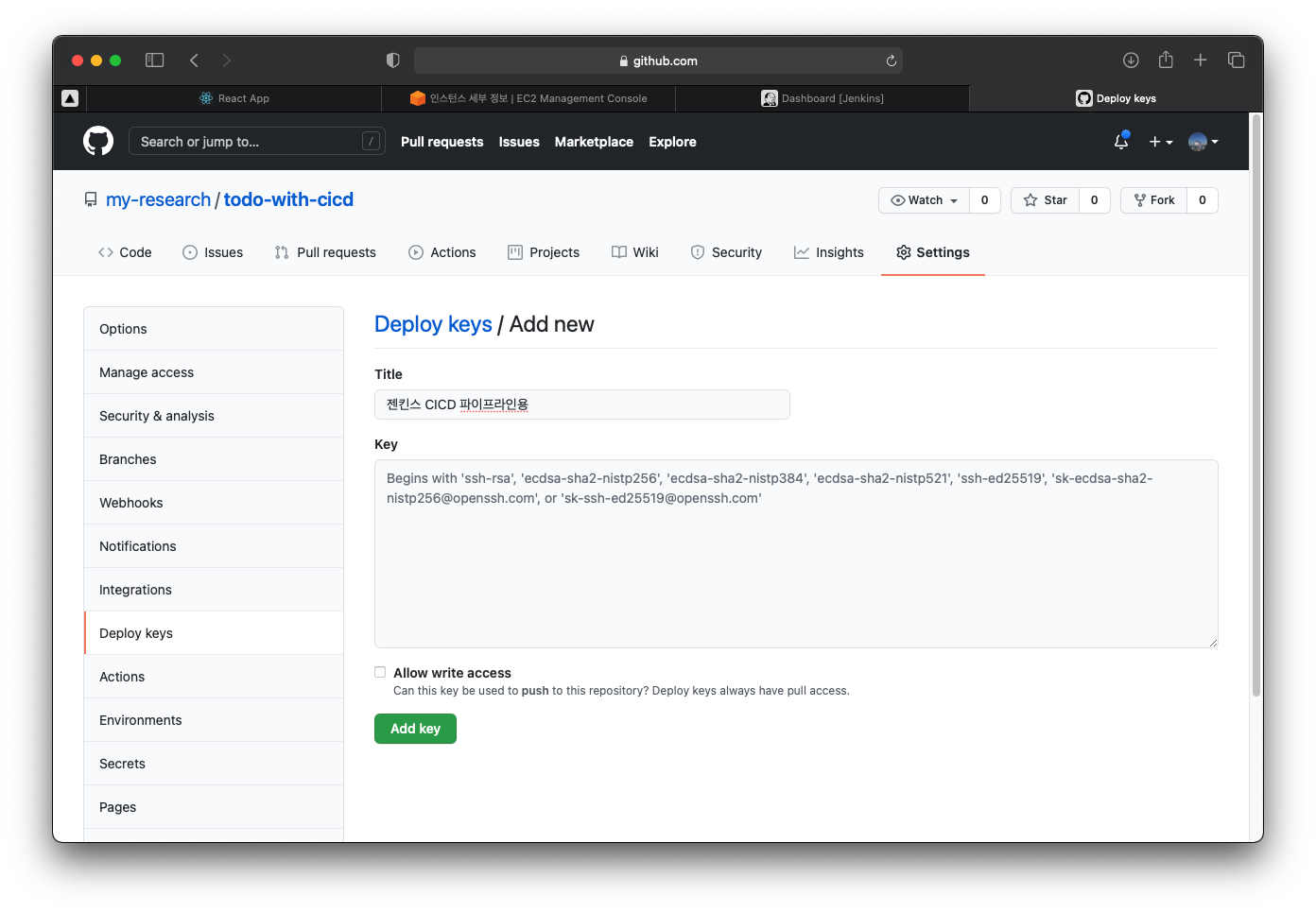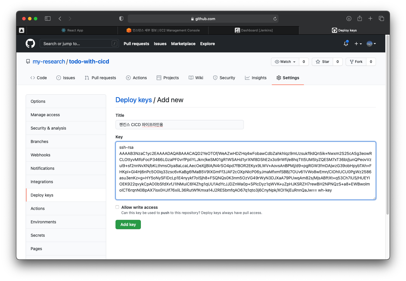 ์ด์ ์ฐ๋ฆฌ์ ์ฝ๋๊ฐ ์ ์ฅ๋ Github ์ผ๋ก ๊ฐ์ Setting ์์ Deploy keys๋ฅผ ์ถ๊ฐํ์