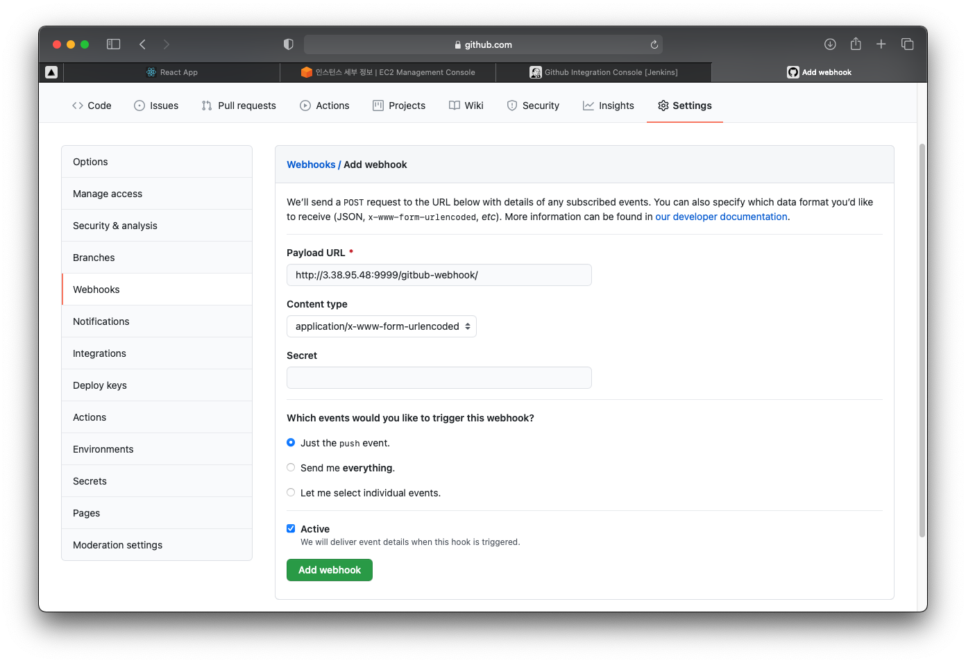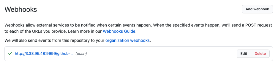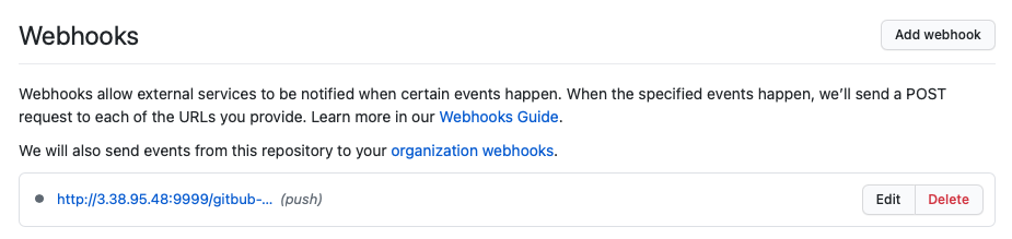 URL์ ์์ ๊ฐ์ด EC2 ์ธ์คํด์ค์ 9999 ํฌํธ๋ก ์ค์ ํ๊ณ /github-webhook/ ์ ์ถ๊ฐํด์ฃผ์.