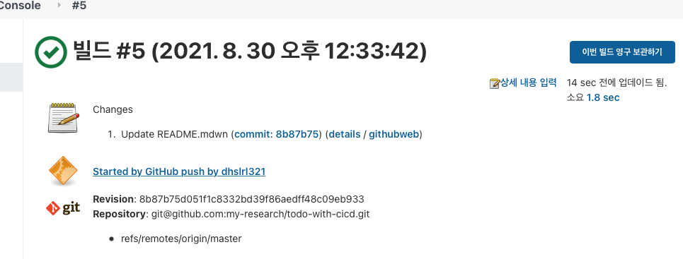 ๊ทธ๋ฆฌ๊ณ ๋ค์ Jenkins ๋์๋ณด๋๋ก ๋ค์ด๊ฐ์ ๋ฐ๋ ๋ณ๊ฒฝ์ ์ด Build ๋์๋ค๋ฉด ์ฑ๊ณต์ ์ผ๋ก ์๋ฃ๋ ๊ฒ์ด๋ค