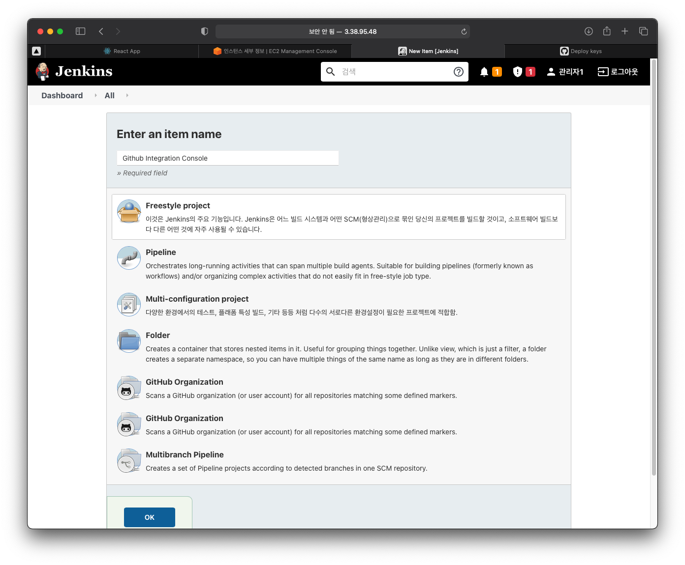 ๋์๋ณด๋์์ New Item ์ ํด๋ฆญํ๊ณ ๋ค์๊ณผ ๊ฐ์ด Freestyle Project๋ก ์๋ก์ด Item์ ์์ฑํ๋ค.