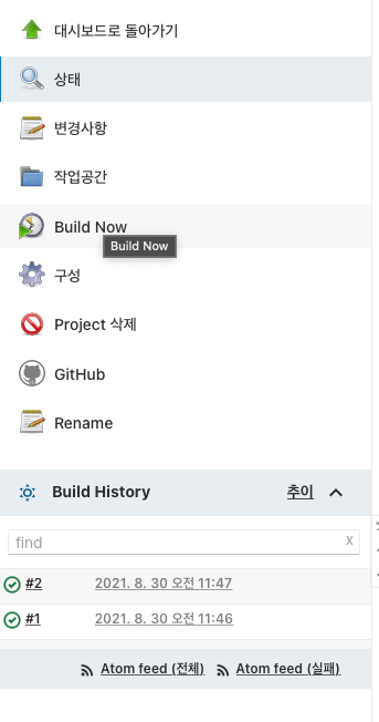 ๊ทธ๋์ Build Now ๋ฅผ ํด๋ฆญํด์ฃผ๊ณ Build History ์์ ์ฑ๊ณต์ ์ผ๋ก Build๊ฐ ๋๋ค๋ฉด ๋ค์ ์คํ ์ผ๋ก ๋์ด๊ฐ์