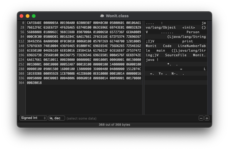 κ·Έλ¦¬κ³ μ΄ λ°μ΄ν°λ₯Ό HexDλ Hex Viewer λ‘ νμΈνλ€λ©΄ Byte ννλ‘ μ§μ νμΈν μ μμ§λ§ μμ΄ μΈλ 거리λ―λ‘ javap λ‘ λμ»΄νμΌλ§μ νκ³ λ³΄κΈ° νΈνκ² λ°κΏλ³΄μ.