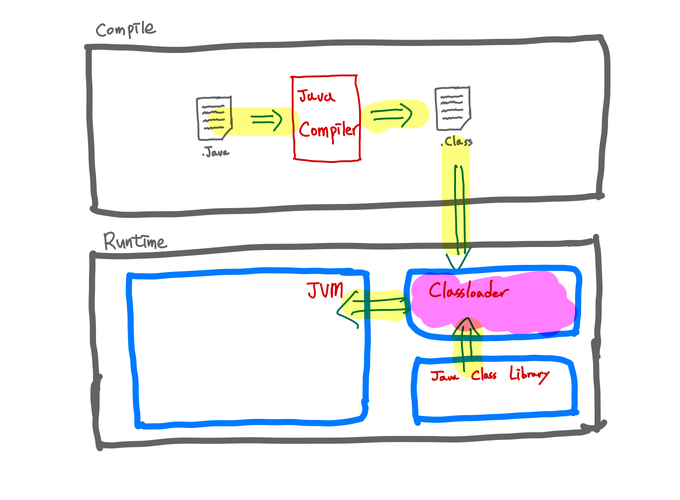 javac μ»΄νμΌλ¬μ μν΄ μ¬μ©μκ° μμ±ν .java μμ€μ½λλ₯Ό μ»΄νμΌνμ¬ Bytecode λ₯Ό μμ±νκ³ ν΄λΉ .class νμΌμ Runtime μΌλ‘ κ°μ Έκ°λ μ΄ μμ μ Java ClassLoader κ° λμνλ€.