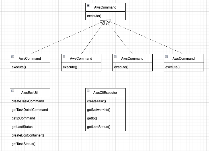 Command 패턴이란 요청을 객체의 형태로 캡슐화하는 것인데, 이를 위해서 aws-cli 에 보내야하는 요청을 캡슐화하여 AwsEcsUtil 에서 각각의 command 를 trigger 한다.