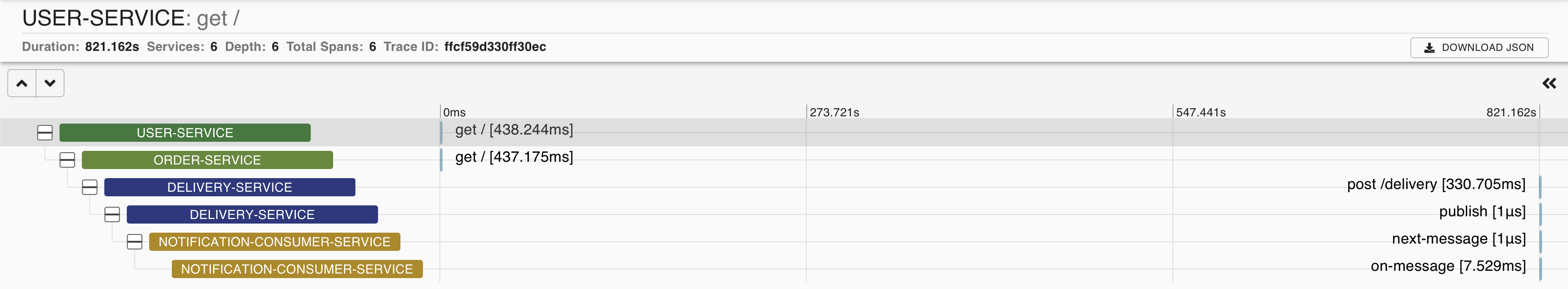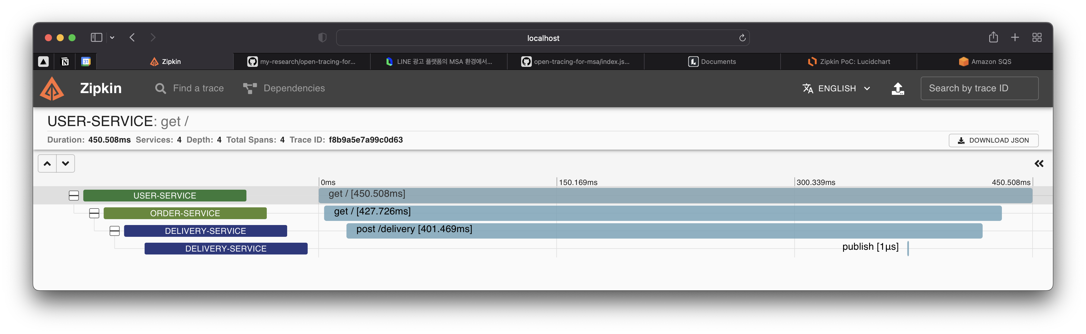 localhost:8000 μΈ user-service λ‘ μμ²μ 보λ΄λ©΄ λ€μκ³Ό κ°μ μ 보λ€μ΄ zipkin dashboard μ μ°νκ² λλ€.