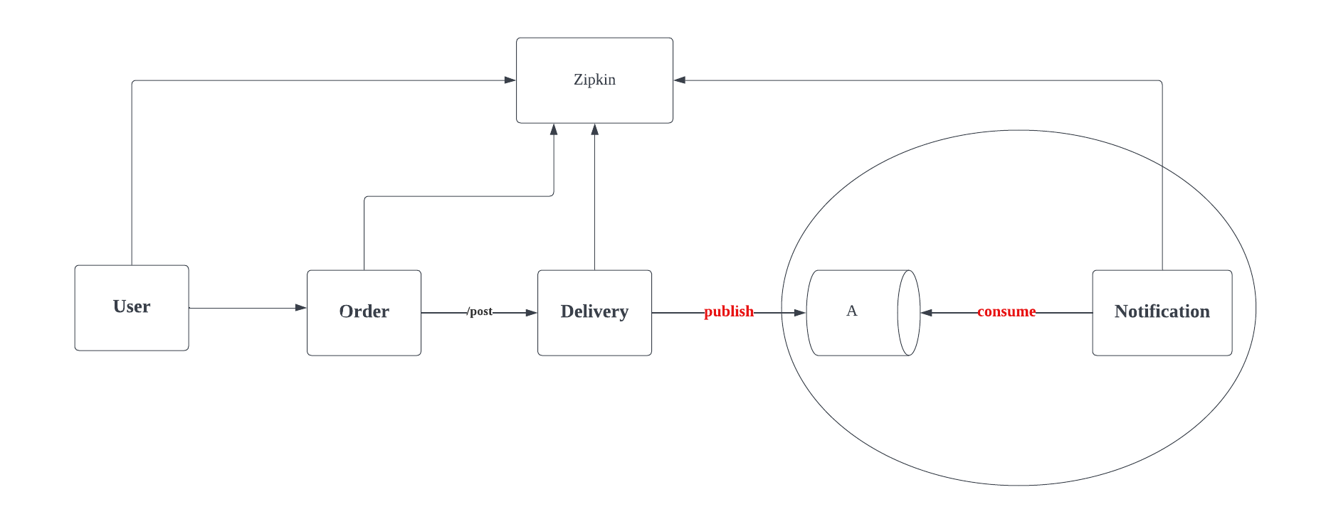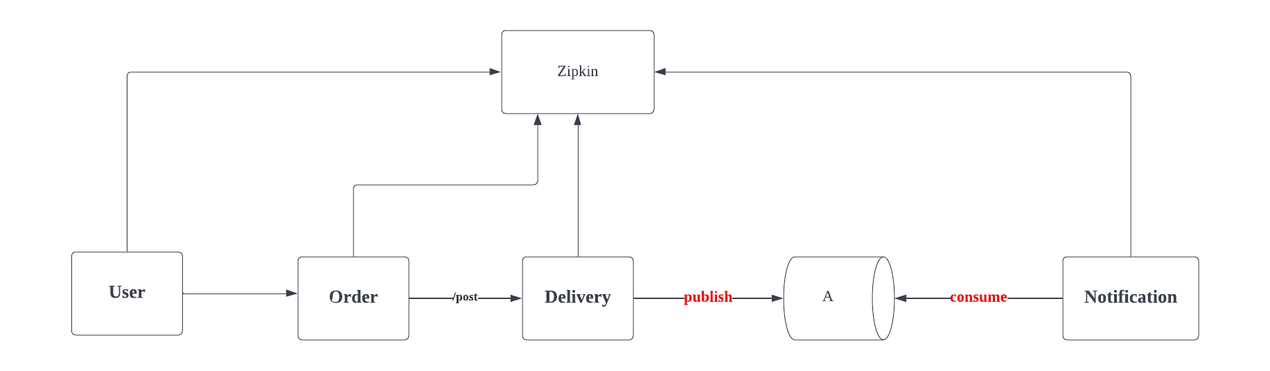 μ¬μ©μ (User) κ° μ£Όλ¬Έ (Order) μ νλ€λ©΄ μ¬μ©μμ μ 보μ μ£Όλ¬Έ μνμ μ 보λ₯Ό ν λλ‘ λ°°μ‘ (Delivery) νκ³ , λ°°μ‘μ΄ μμλμλ€λ μλ¦Ό (Notification) μ μ μ‘νλ€.