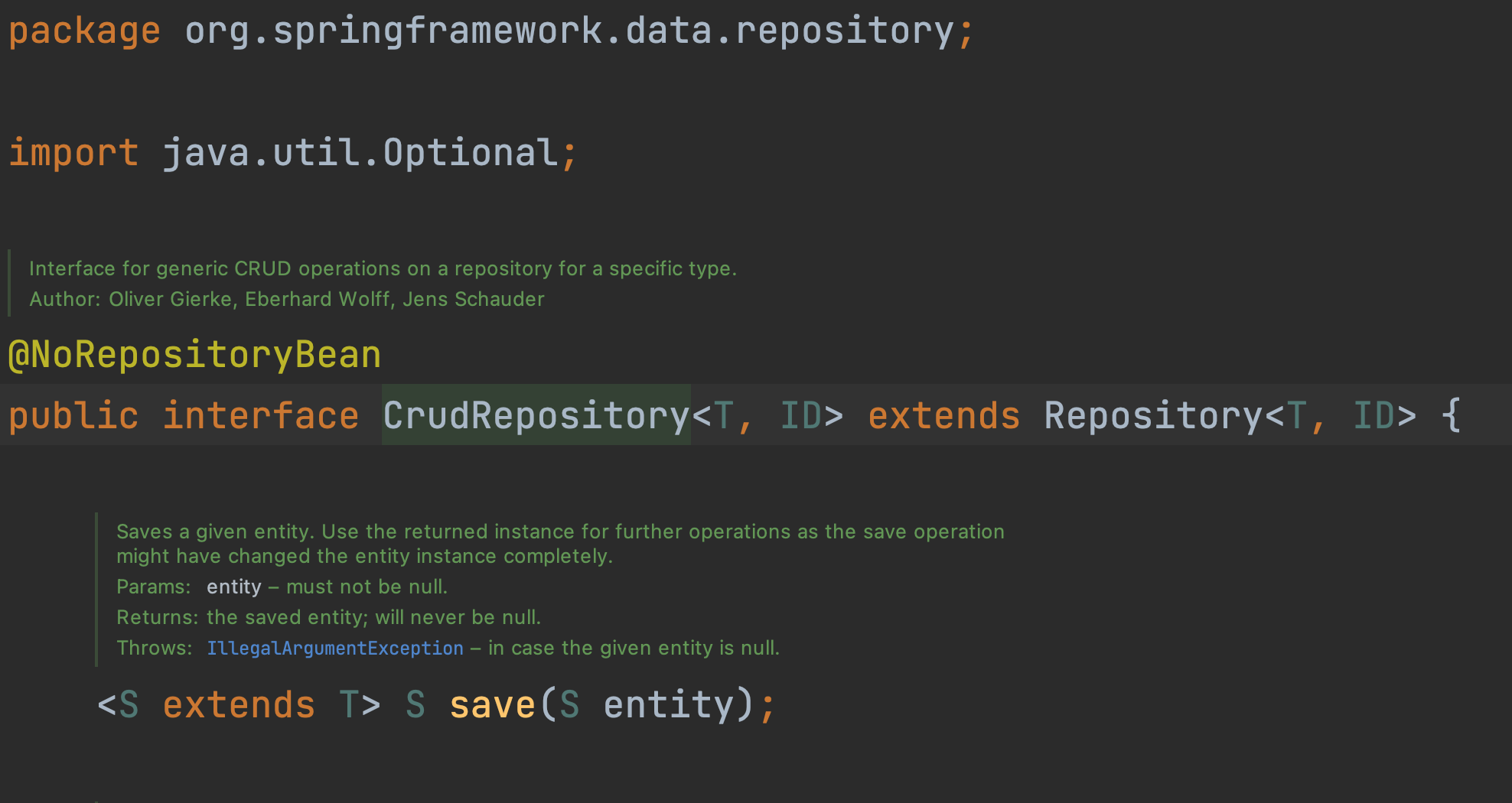 이는 Spring Data 모듈의 CrudRepository 라는 인터페이스이다