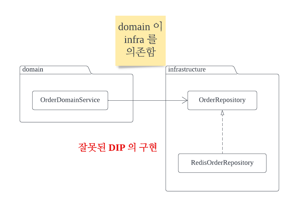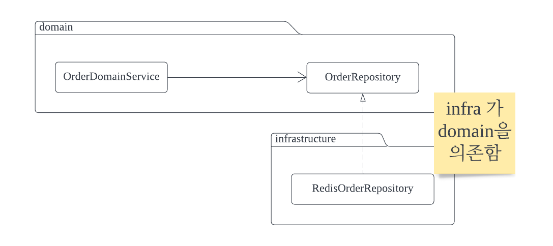 νμ§λ§ μ¬μ ν κ³ μμ€ λͺ¨λμ΄ μ μμ€ λͺ¨λμ μμ‘΄νκ³ μλ€. μ¦, μμ‘΄μ κ΄μ μμ λ³Έλ€λ©΄ OrderDomainService κ° infrastructure λ₯Ό μκ² λλ ννμ΄λ€.