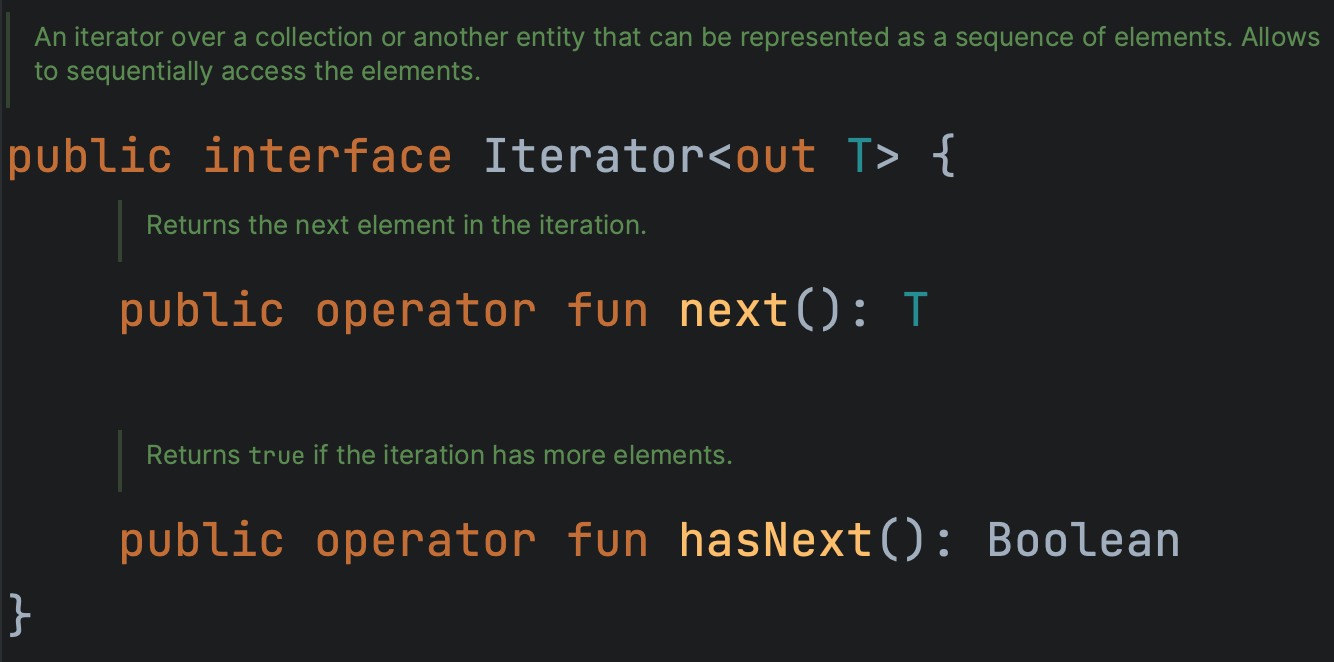 위의 내용에 대해서는 구현 코드가 어떻게 되었든 java/kotlin 을 이용해서 개발을 하는 개발자라면 Iterator 에 대해서 잘 알고 있을 것이다.
