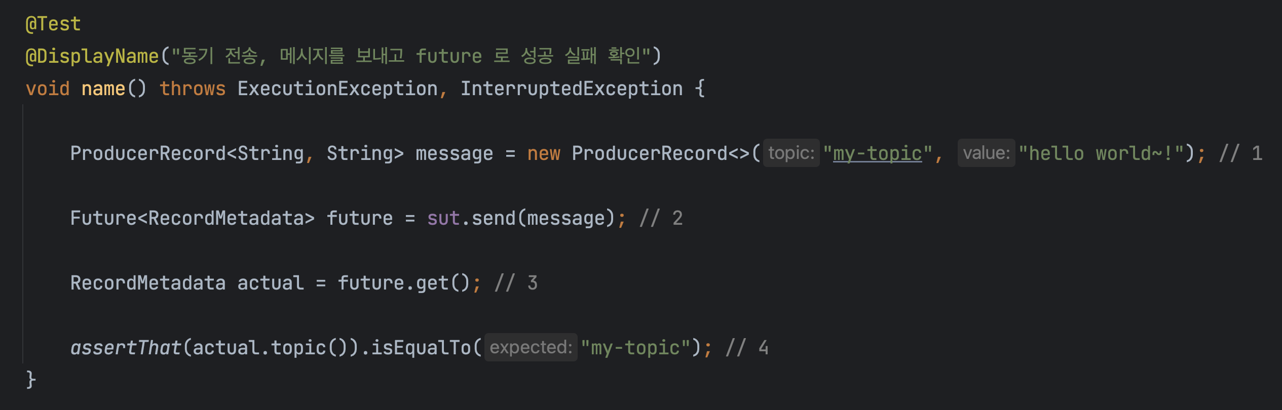 Future.get()μ°μ°μ ν΅ν΄ λΉλκΈ° produce response λ₯Ό blocking νλ€ - μ£Όμ 4. produce κ²°κ³Όλ‘ λ°νλ μ 보μ λν λ¨μΈλ¬Έ
