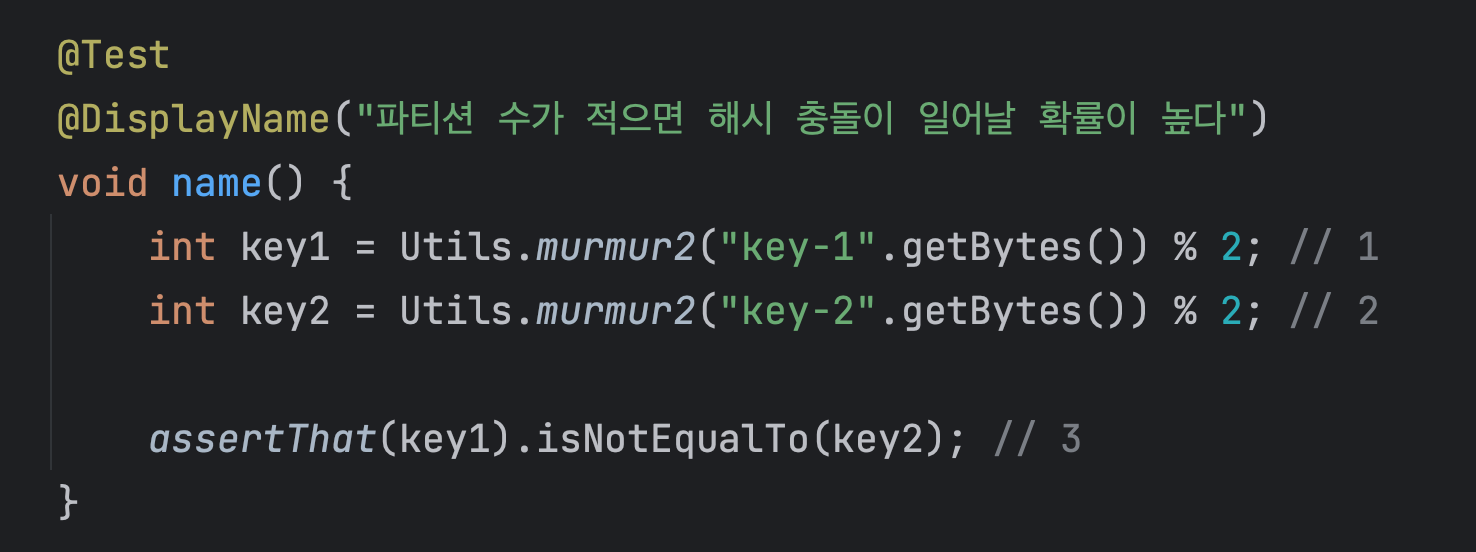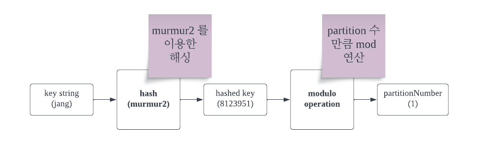 - key-1 μ΄λΌλ λ¬Έμμ΄μ hash νκ³ μμμ νν°μ μ(2) λ§νΌ mod μ°μ°μ μννμ¬ νν°μ λ²νΈλ₯Ό ꡬνλ€