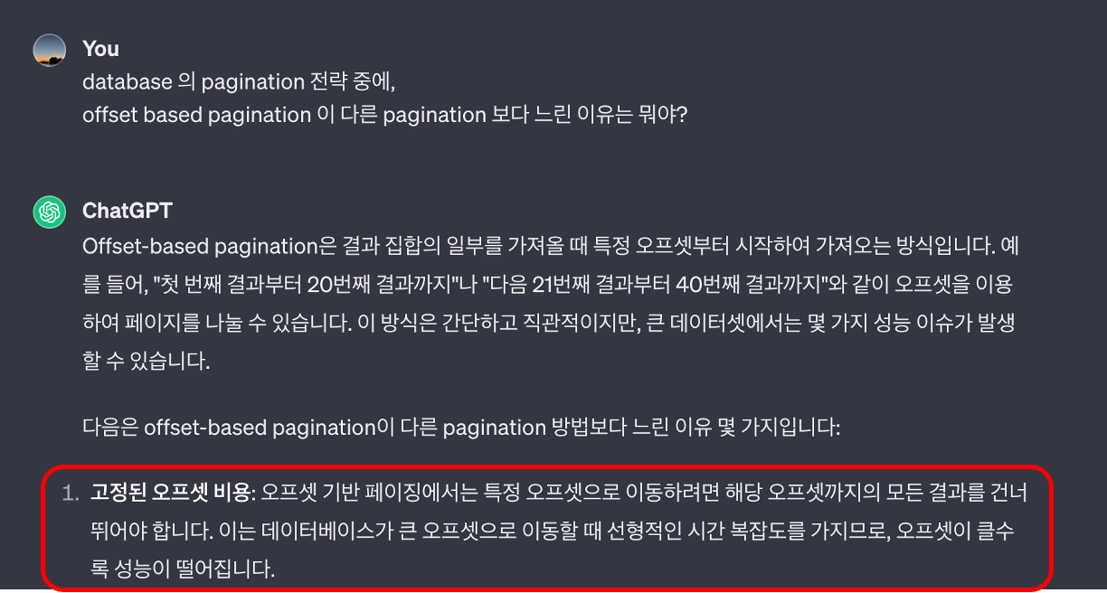Chat GPT ํํ ์ offset based paging ์ด ๋๋ฆฐ์ง ๋ฌผ์ด๋ณด์