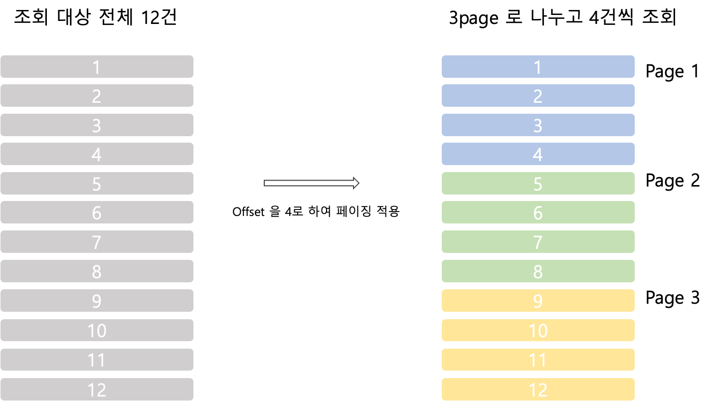 - ์ ์ฒด ๋ฐ์ดํฐ๋ฅผ ํน์ page ๋จ์๋ก ๋๋์ด offset ๋ถํฐ page ๋งํผ๋ง ์กฐํํ์ฌ ๋ฐ์ดํฐ๋ฅผ ์ฒ๋ฆฌํ๋ ๋ฐฉ๋ฒ