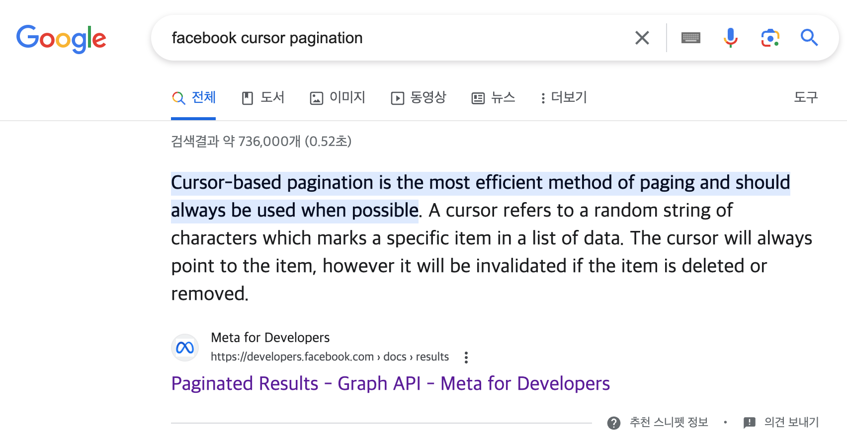 ๋ง๋ ๋ง์ด๋ค. ํ์ด์ค๋ถ์์๋ ๊ฐ๋ฅํ ํญ์ cursor based pagination ์ด ์ฌ์ฉ๋์ด์ผ ํ๋ค๊ณ ๊ฐ์กฐํ๋ค.