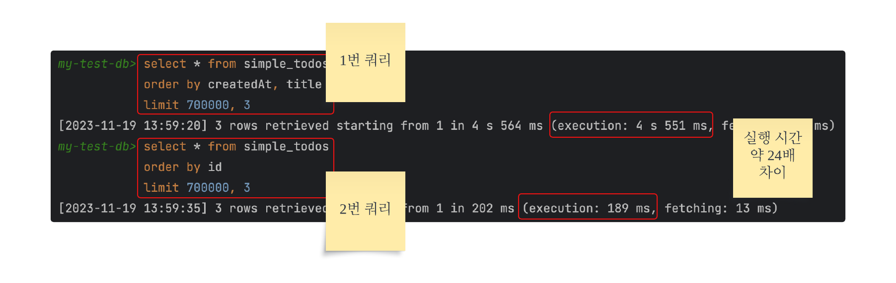 page ๊ฐ ์ถฉ๋ถํ ๊น๊ณ ์ฑ๋ฅ ํ๋ฝ์ด ๋ช ํํ๊ฒ ๋ณด์ด๋๋ฐ, ๋ ์ฟผ๋ฆฌ๋ ์คํ ์๊ฐ์ด ๊ฑฐ์ 24๋ฐฐ์ ๋ฌํ๋ค.