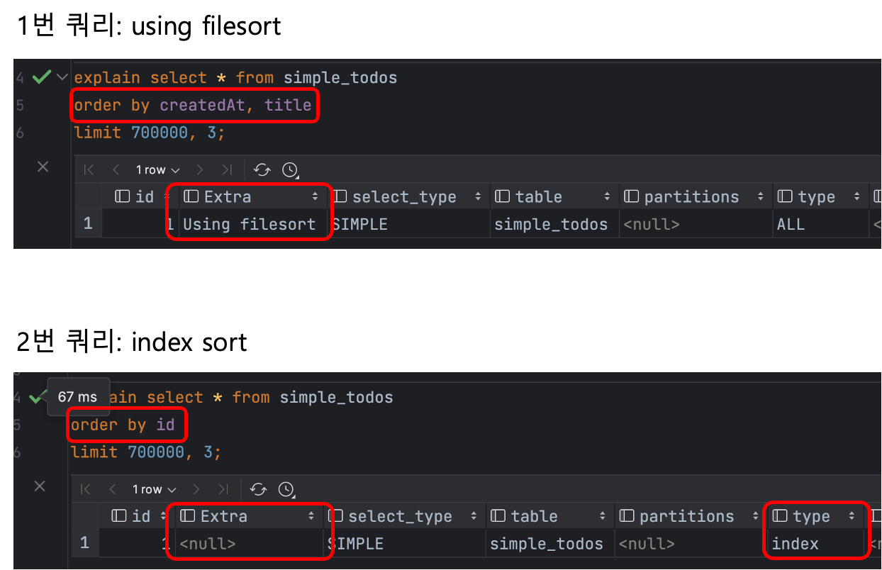 ๊ฒฐ๊ตญ ์ ๋ ฌ์ ํ ๋ index ๋ฅผ ์ฌ์ฉํ ์ ์๋๋ ๋ง๋๋๊ฐ ๋ ์ฟผ๋ฆฌ๊ฐ์ ์คํ ์๊ฐ์ ๊ฒฐ์ ํ๋ ๊ฒ์ด๋ค.