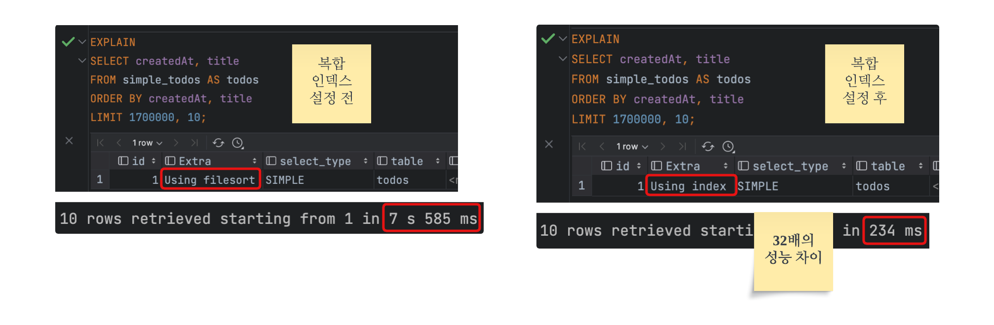 - filesort λ₯Ό index sort λ‘ λ°κΎΈκΈ° μν΄ μ λ ¬ 쑰건μ composite index λ₯Ό μ μ©νμλ€