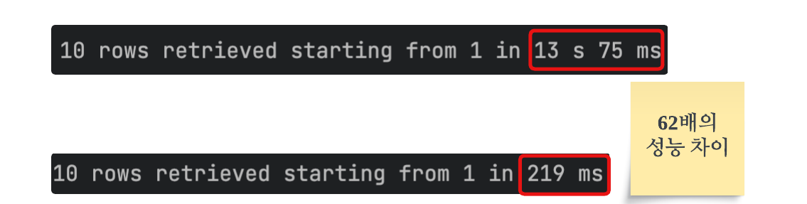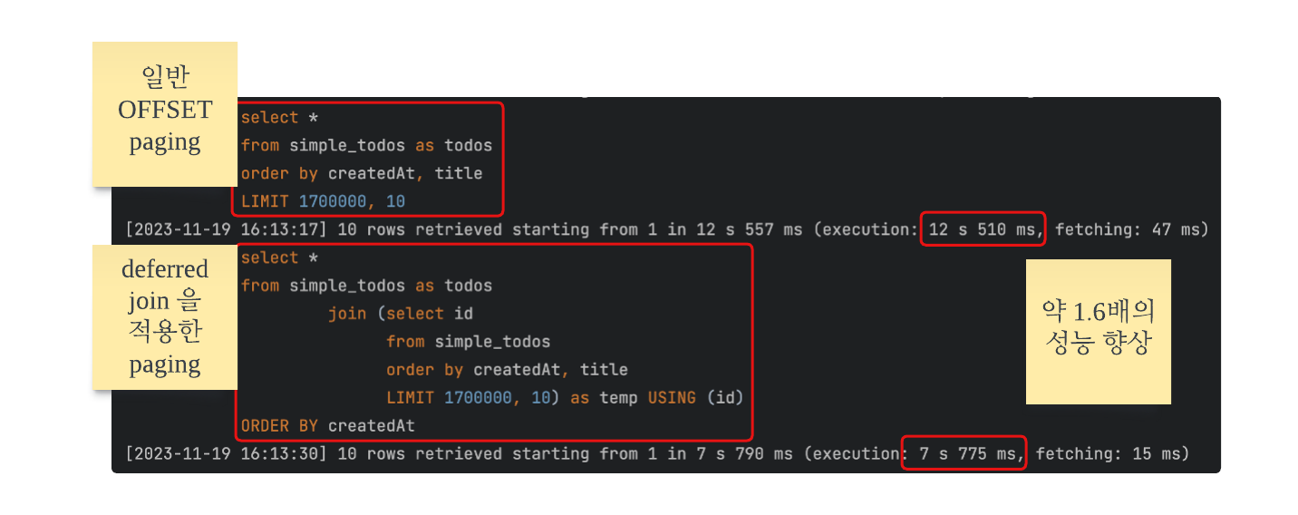 μ΄ κ³Όμ μ κ±°μΉλ©΄, λ€λμ λ°μ΄ν°λ₯Ό μ‘°ννλ OFFSET 쿼리μμ id λ§ μ‘°ννκ² λκ³ , μλ ν μ΄λΈκ³Ό join μ νμ¬ μ 체 κ²°κ³Όλ₯Ό μ»μ μ μκ² λλ€.