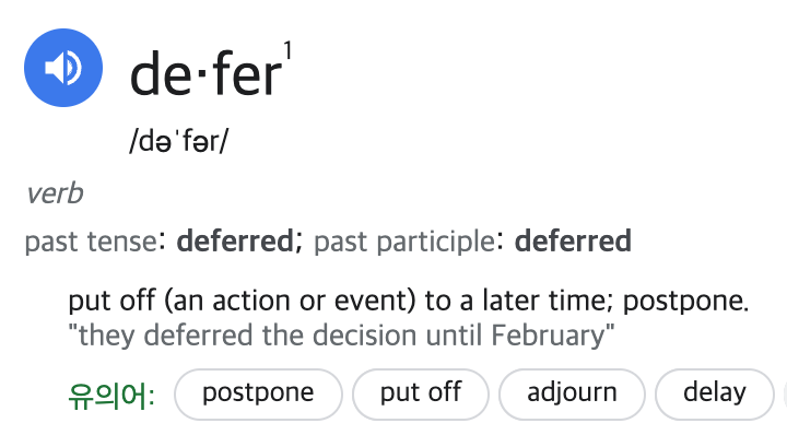 deferred λΌλ λ»μ postponed, delay μΌλ‘ μ§μ°μν€λ€λ μλ―Έλ₯Ό κ°μ§κ³ μλ€.