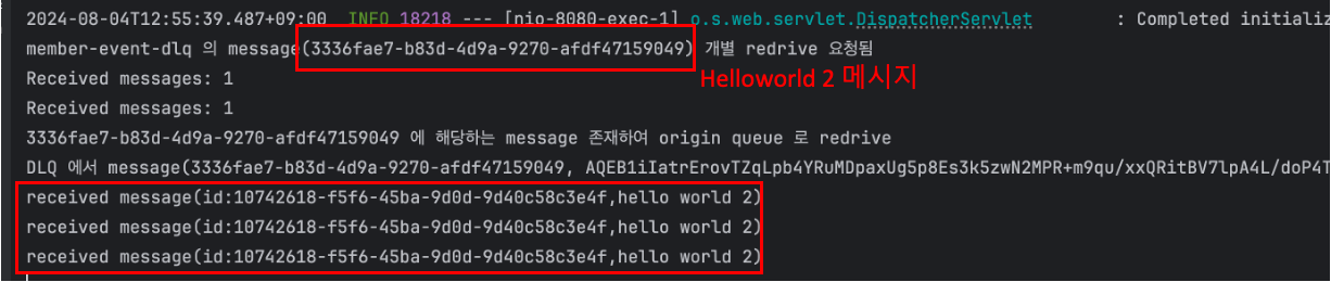 ๊ทธ๋ฆฌ๊ณ ์์ ๋ง๋ API ๋ฅผ ํตํด ๊ฐ๋ณ redrive ๋ฅผ ํธ์ถํ๋ฉด ์๋์ ๊ฐ์ด ์ ์์ ์ผ๋ก ์๋ณธ Q ๋ก ๋ฉ์์ง๊ฐ redrive ๋๋ ๊ฒ์ ํ์ธํ ์ ์๋ค.