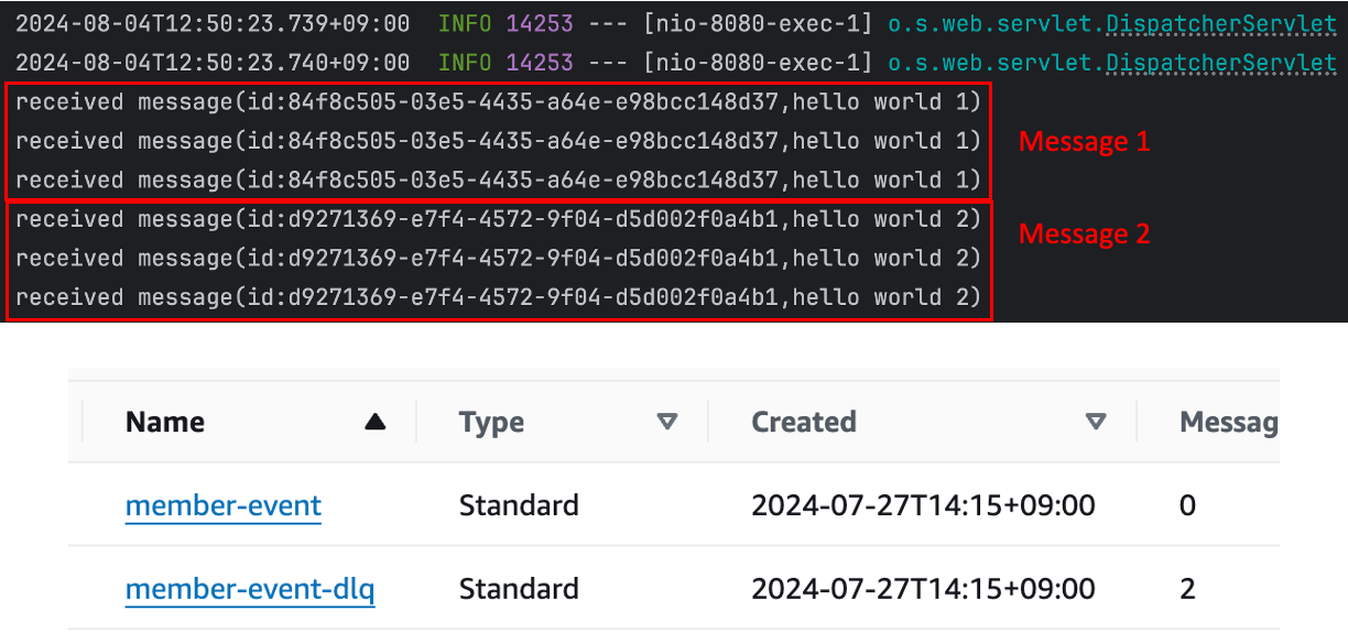 ์์ ํ ์คํธ์ ๋ง์ฐฌ๊ฐ์ง๋ก ์ฐ๋ฆฌ๊ฐ ๋ง๋ ๊ธฐ๋ฅ์ ํ ์คํธํ๊ธฐ ์ํด์ DLQ ์ ๋ค์ 2 ๊ฐ์ ๋ฉ์์ง๋ฅผ ์์๋ค.