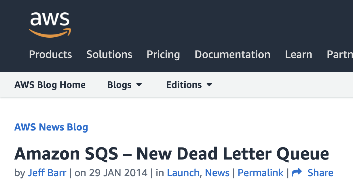 AWS ๋ 2014๋ DLQ ๋ฅผ ๊ณต๊ฐํ๋ฉฐ SQS ์์ ์ฒ๋ฆฌ๋์ง ์์ ๋ฉ์์ง๊ฐ ๊ณ์ํด์ queue ์ ๋จ์์๋ ๋ฌธ์ ๋ฅผ ํด๊ฒฐํ์๋ค.