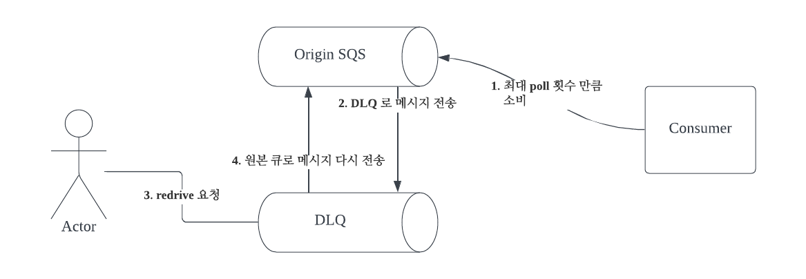 redrive ๋, DLQ ์ ์ ์ฅ๋ ๋ฉ์์ง๋ฅผ consumer application ์ด ํด๋น ๋ฉ์์ง๋ฅผ ๋ค์ ์ฒ๋ฆฌํ ์ ์๋๋ก origin queue ๋ก ์ฎ๊ธฐ๋ ๊ฒ์ ์๋ฏธํ๋ค.