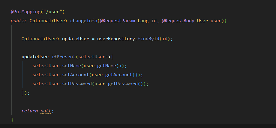 2. ๋งค๊ฐ๋ณ์๋ก ๋ค์ด์จ id ๊ฐ์ผ๋ก ๋ณ๊ฒฝํ User๋ฅผ ์ฐพ๋๋ค.
