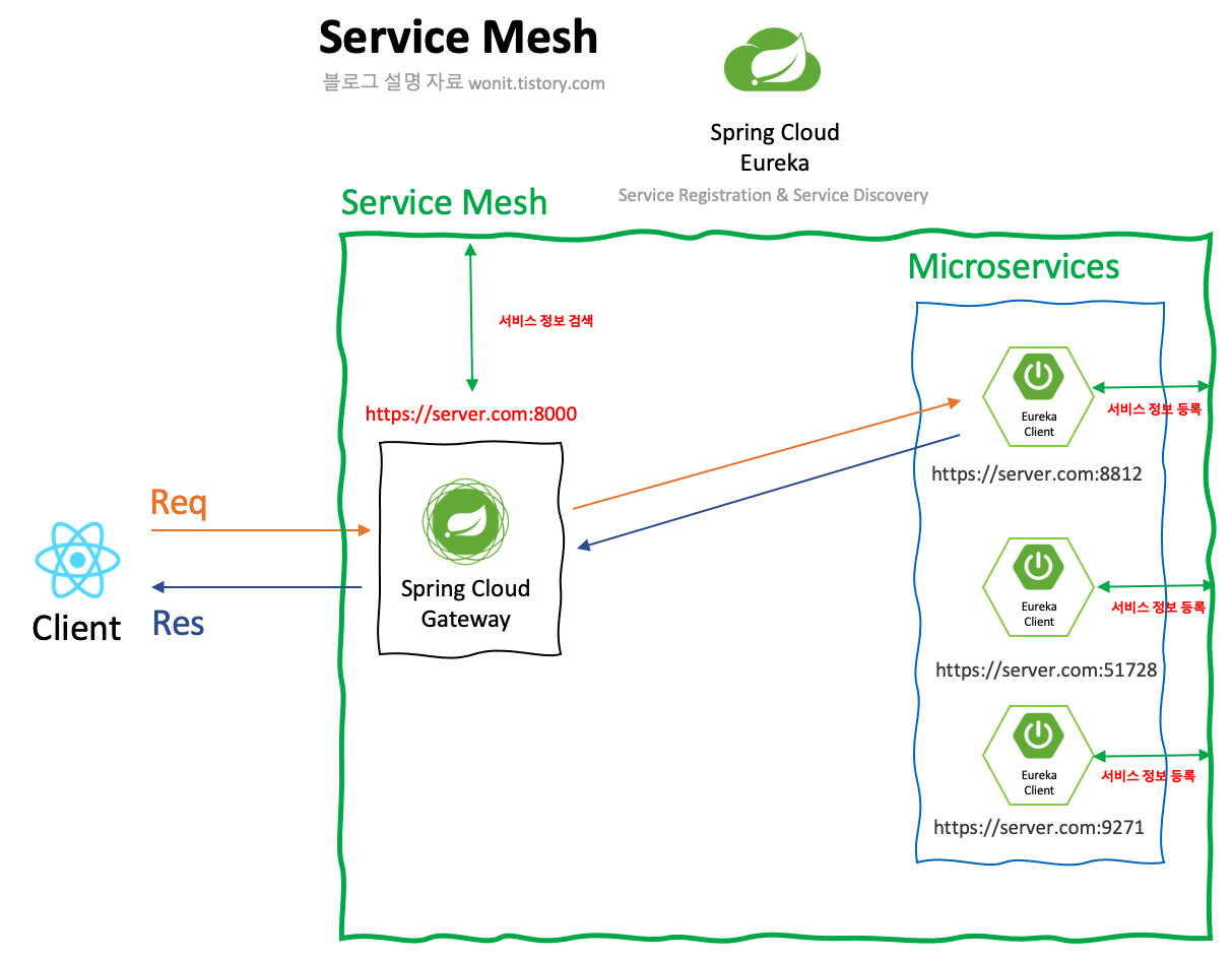 ๊ทธ๋ผ ๊ฐ๊ฐ์ ๋ง์ดํฌ๋ก์๋น์ค๋ค์ IP ์ ๋ณด๋ ์ผ์ผ์ด ๋ฑ๋กํ์ง ์๋๋ผ๊ณ Discovery ์๋ฒ๊ฐ ๊ด๋ฆฌํ๊ฒ ๋๋ค.