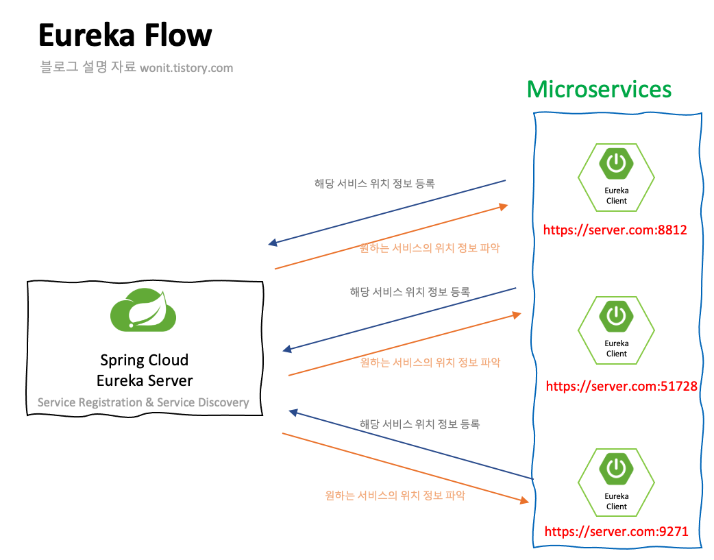 Spring Cloud Eureka๋ ์๋์ ๊ฐ์ ์์๋ก ๋์ํ๊ฒ ๋๋ค.