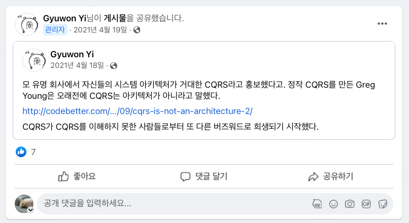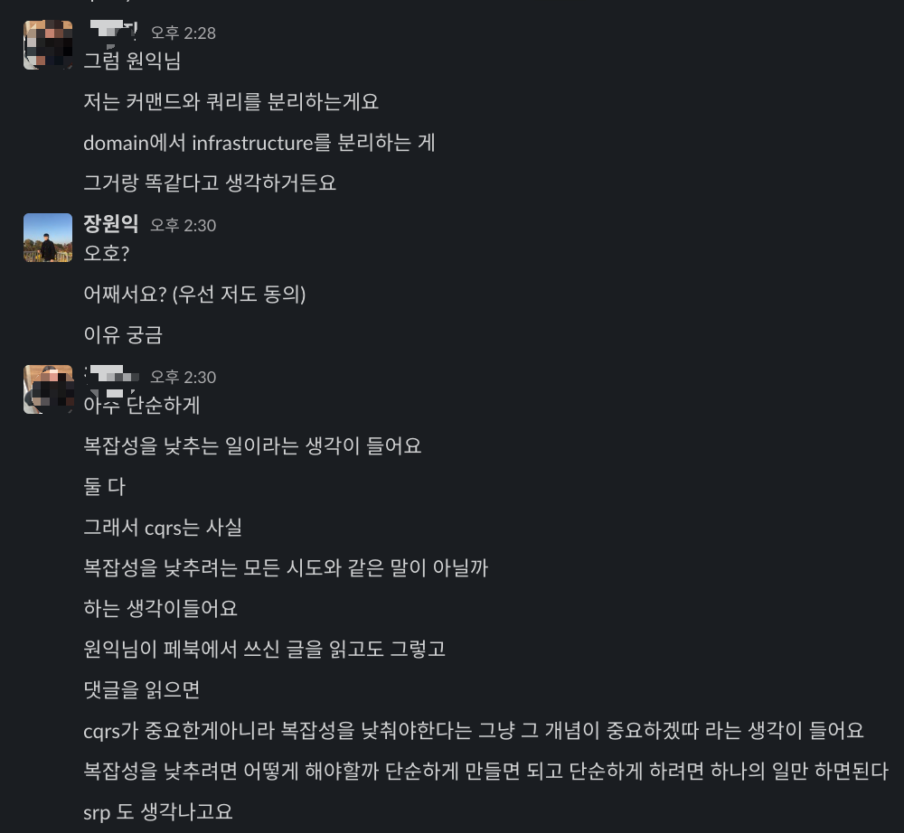 위 이야기가 나온 이유는 즉, 내가 CQRS 에 많은 관심을 두고 있고 대화에서 비슷한 주제의 이야기들을 많이 쏟아냈기 때문이었다.